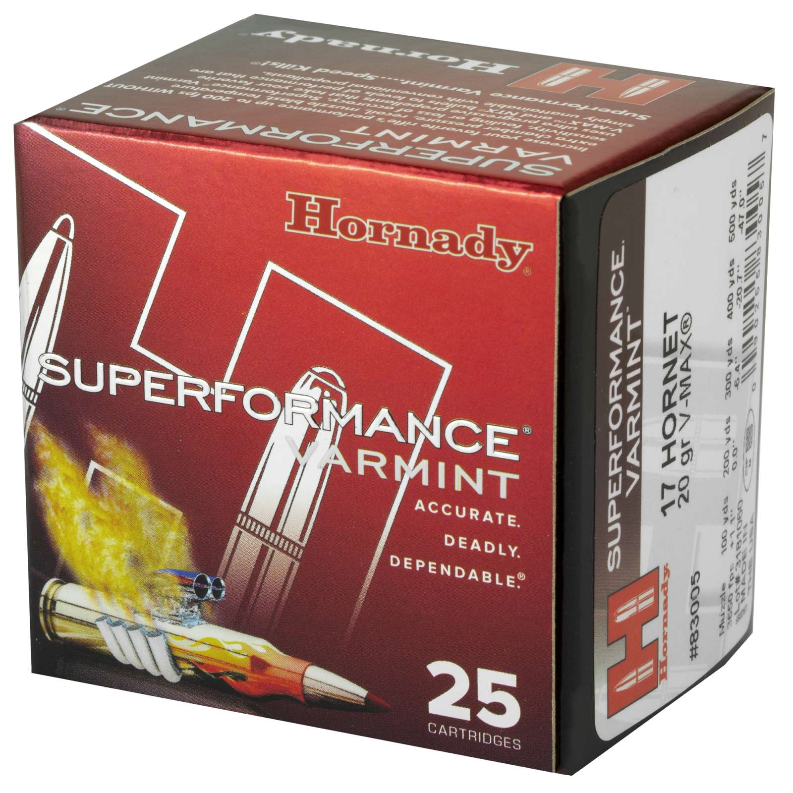 Speed Kills. Varmint hunters can now reap the benefits of Hornady Superformance propellant technology in their favorite varmint cartridges. Superformance Varmint ammunition delivers muzzle velocity increases of 100 to 200 feet per second, accuracy, increased range, flatter trajectory, less wind drift and devastating terminal. It utilizes a polymer tipped bullets which delivers match accuracy and rapid fragmentation. Optimal results are achieved in all firearms, and Superformance Varmint ammunition is safe to use in all action types, including semi-autos. This 17 Hornet load features a V-Max bullet with a 20 grain weight and comes packaged 25 rounds per box, 10 boxes per case.