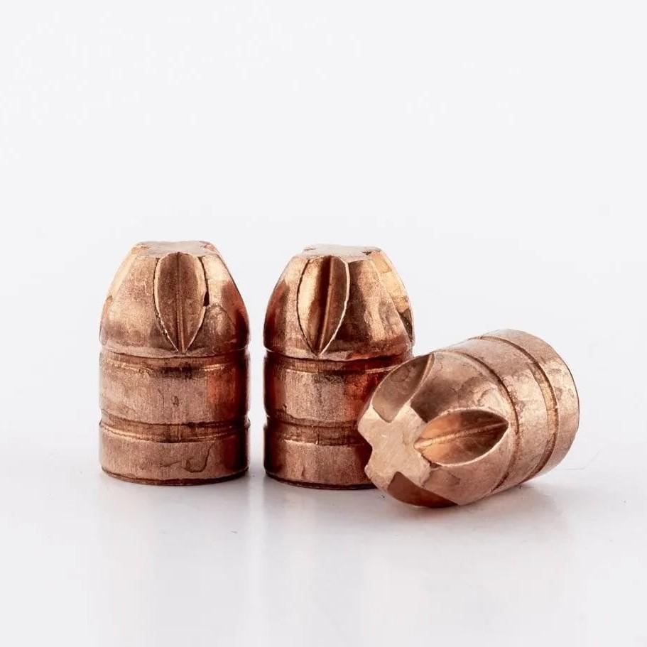 The magic happens with the nose design where the Fluid Transfer’s radial flutes force the hydraulic energy inward and then as the energy is restricted it accelerates outward creating high pressure spikes severely damaging surrounding tissue. This very rapid increase in fluid flow creates cavitation and massive tissue damage away from the projectile equivalent to those of the best hollow points on the market. This results in a permanent wound cavity that is two to four times greater than what a flat or round nose bullet generates and often larger than traditional or solid copper expanding bullets. What you get is a hunting or special application self defense bullet that creates a larger permanent wound cavity coupled with exceptionally deep penetration.