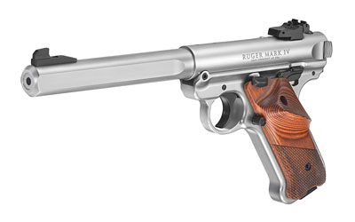 The Ruger Mark IV Rimfire Pistols have the classic look of the Mark III with a simple, one-button takedown for quick and easy field stripping. A recessed button in the back of the frame allows the upper receiver to tilt up and off of the grip frame without the use of tools. The bolt simply slides out of the receiver and the barrel can be properly cleaned from chamber to muzzle. The MKIV includes other significant improvements such as a one-piece grip frame that is precision CNC-machined from a solid piece of aluminum alloy, an ambidextrous manual safety and a redesigned bolt stop for more ergonomic operation. The magazine drops free on release for faster reloads and a redesigned magazine disconnect safety prevents discharge when the magazine has been removed. Internal improvements include changes to the hammer, sear, bolt and firing pin for smoother, more reliable feeding. Specific features vary by model, but the legendary, one-piece barreled receiver and internal cylindrical bolt construction remain the same. The robust design ensures permanent sight-to-barrel alignment and higher accuracy potential than conventional moving-slide designs. Includes two 10-round magazines.