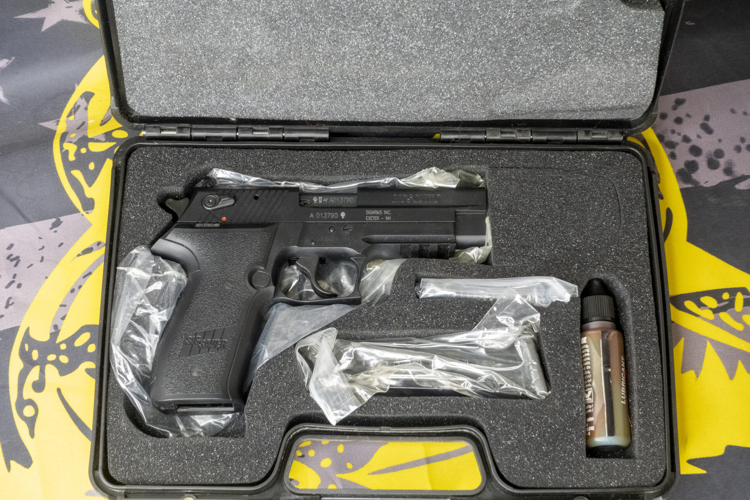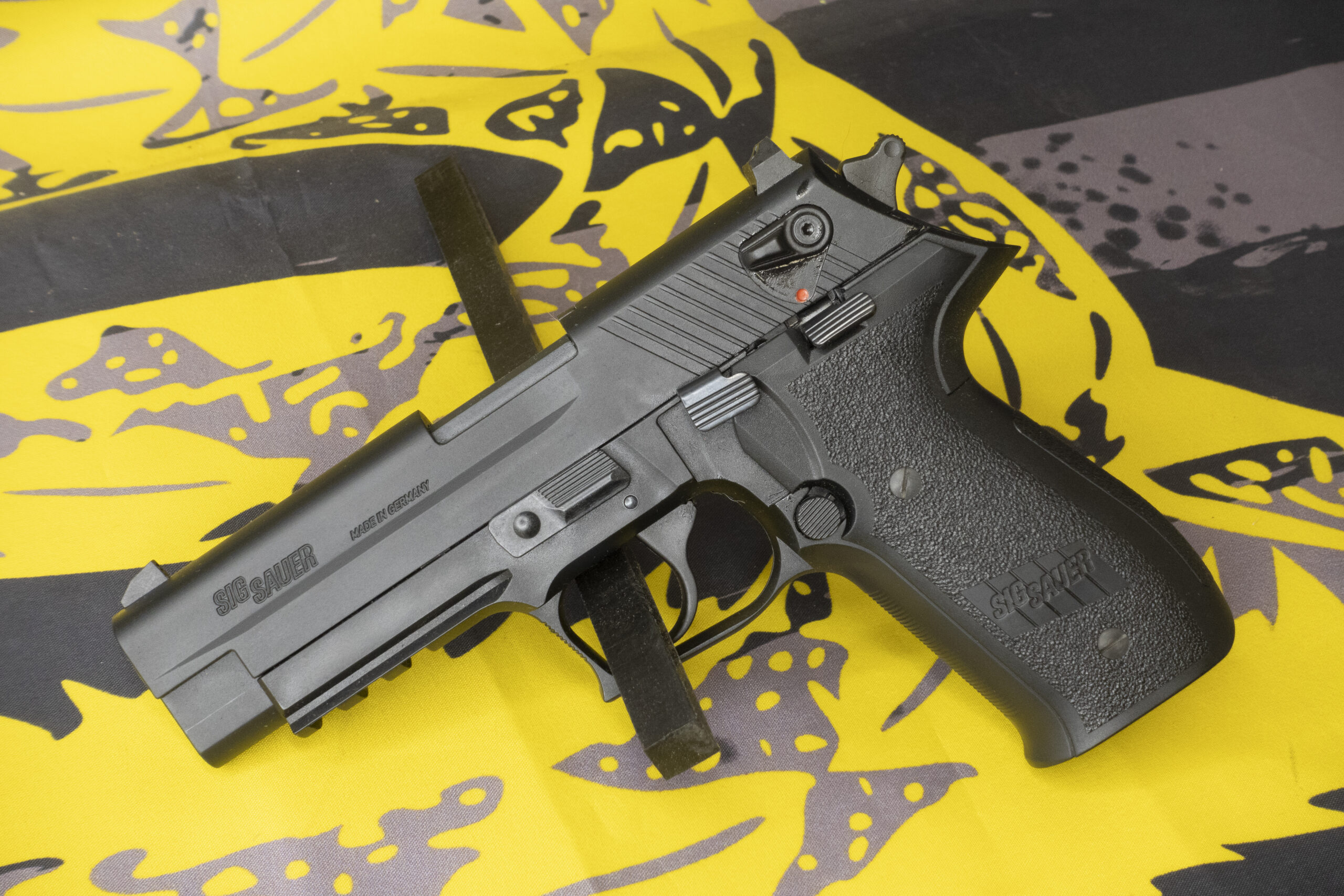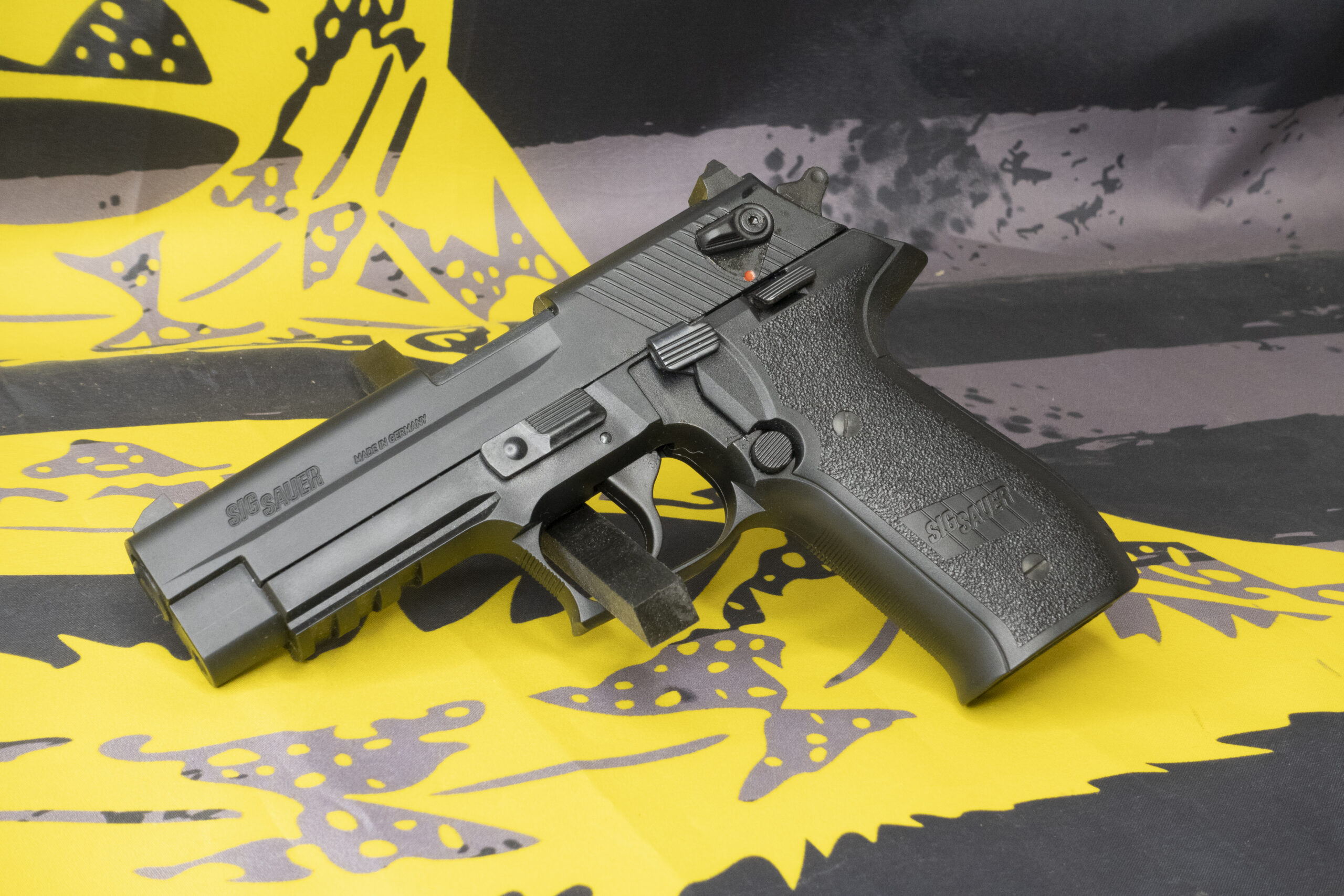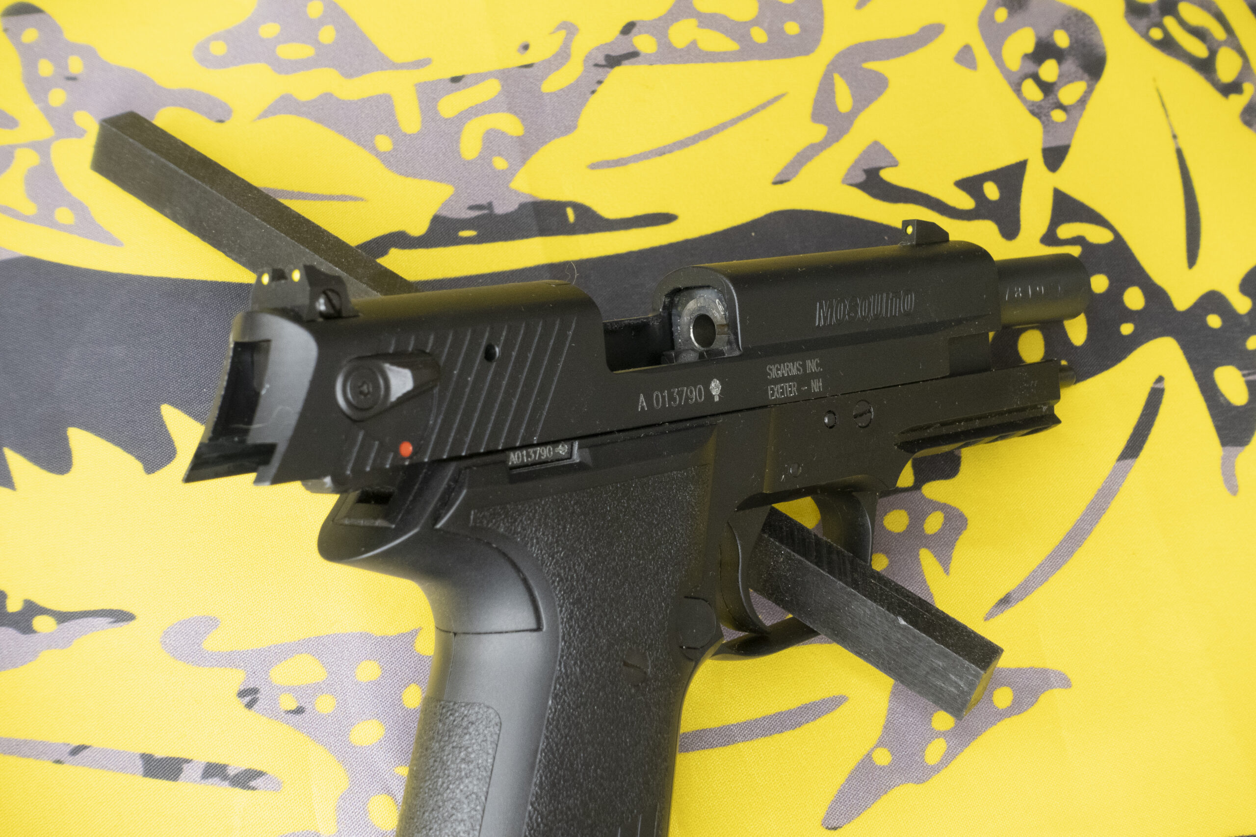 Modeled visually on the SIG Sauer P226 but reduced roughly 10 percent in size, the Mosquito delivers a familiar control layout and easy handling in a lightweight .22 LR package. The blowback-operated, semi-automatic pistol pairs an aluminum-zinc alloy slide with a durable polymer frame for low weight and dependable function. Controls mirror full-size SIG ergonomics and include a left-side takedown lever, a left decocking lever, reversible magazine catch, and ambidextrous manual safety. An integral safety lock at the rear of the magazine well provides an extra layer of inaction when engaged.